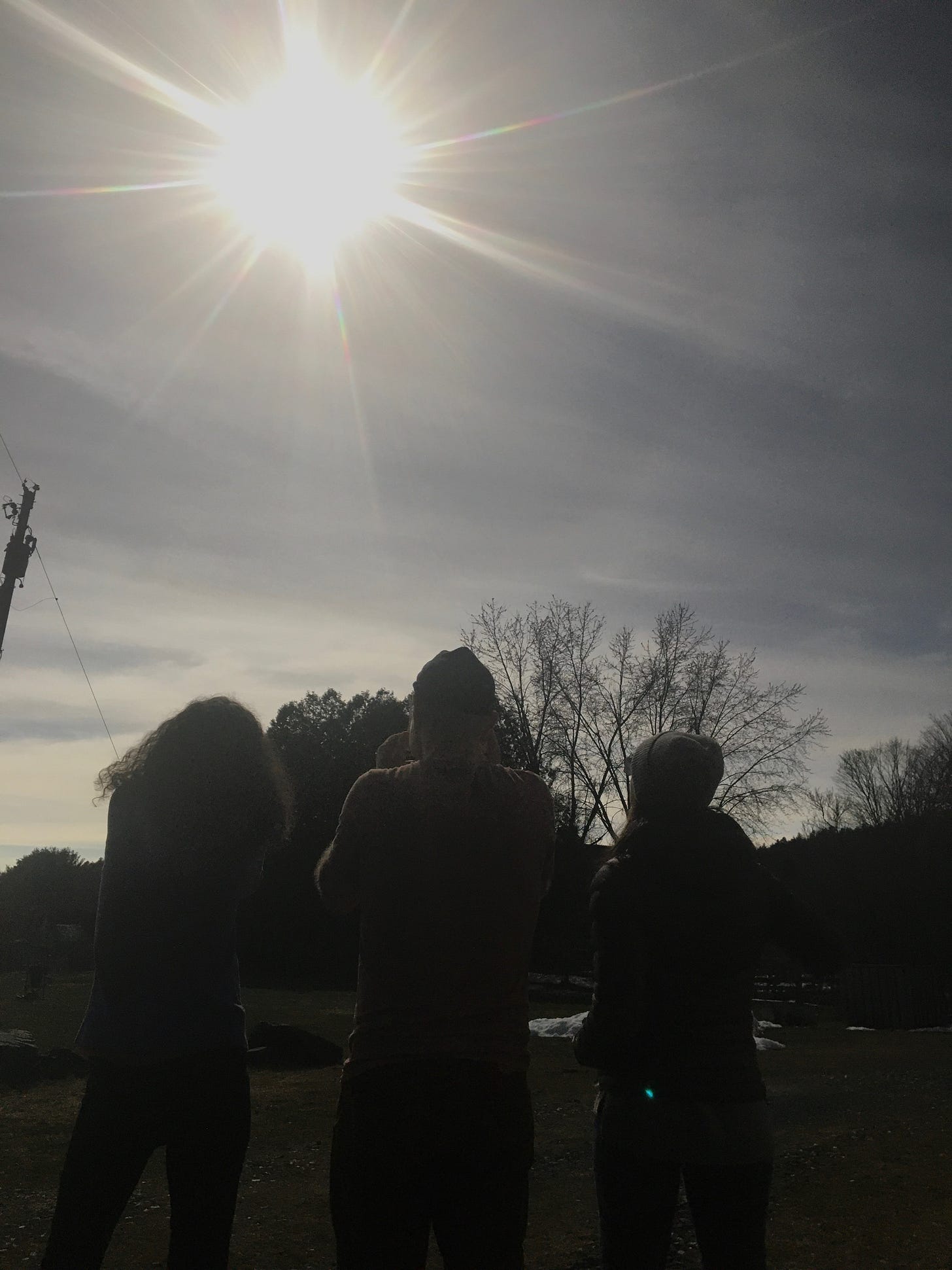 The weather was absolutely incredible that morning. Bluebird skies, a slight breeze and balmy temperatures for April. At around 3 pm we gathered on the back deck, which happened to be at the town park so we had the company of about 25 cars, mostly local families. There was no school today so kids got to experience it as well. It was a festive atmosphere. People had set up pop up tents, or mini tailgate parties out of their cars. We were a few hundred feet away in our yard so we were close enough, but still had our own little space. I used my glasses (carefully, protecting my eyes!!) while looking at the partial eclipse. It was a really neat experience to view the moon slowly passing over the sun, from a sliver to half until a sliver of sun remaining.